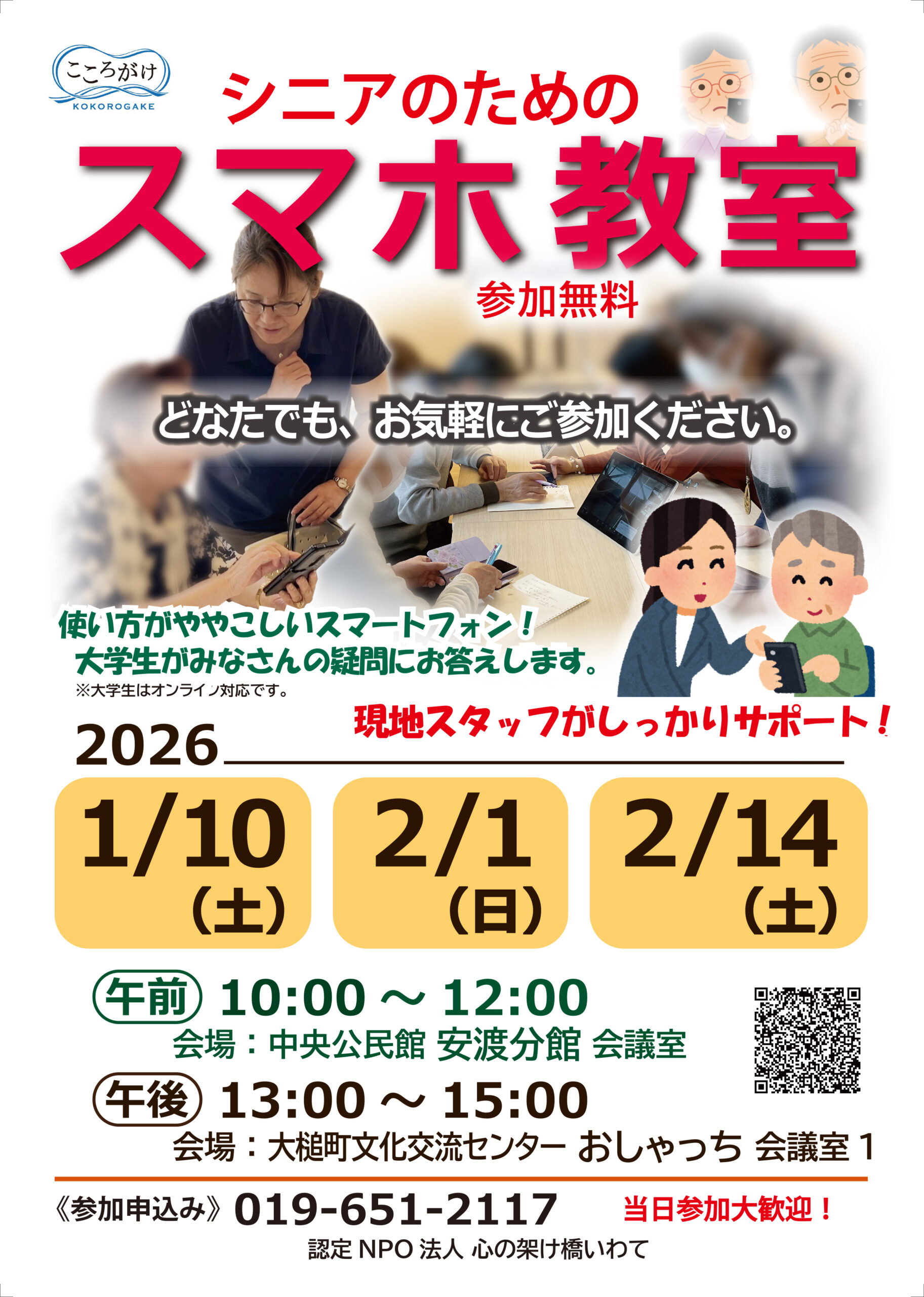 『シニアのためのスマホ教室』開催のお知らせ 昨年大好評でしたスマホ教室を今年も開催です! 大学生がオンラインで疑問にお答えし、 現地スタッフがしっかりサポートします! みなさまお誘いあわせの上ぜひご参加ください。(参加無料) 2月1日(日) と 2月14日(土) 午前の部 10:00-12:00 大槌町中央公民館 安渡分館 午後の部 13:00-15:00 大槌町文化交流センター おしゃっち 共有: X で共有 (新しいウィンドウで開きます) X Facebook で共有 (新しいウィンドウで開きます) Facebook 関連