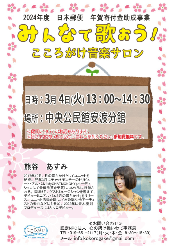 3/4みんなで歌おう!「こころがけ音楽サロン」開催のお知らせ